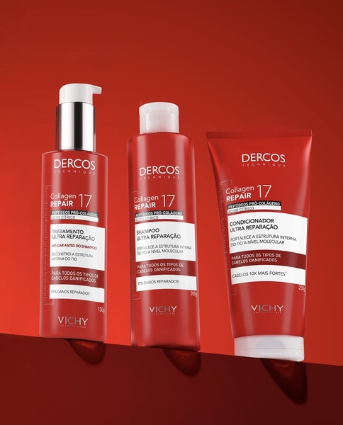 A proposta aqui é aplicar conceitos do skincare ao cuidado capilar. A linha foi desenvolvida para estimular o chamado Colágeno 17, proteína associada à estrutura e sustentação da fibra. O protocolo em três etapas, pré-shampoo, shampoo e condicionador, atua desde a raiz para fortalecer, reduzir a quebra e reparar danos ao longo do comprimento.