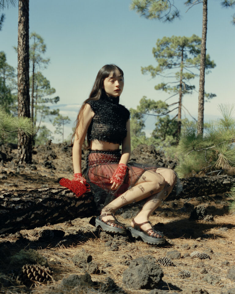 Entre os modelos, três direções se delineiam. A Luna Bloom revisita a sapatilha esportiva com abordagem escultórica. A Daphnis Ballerina propõe uma leitura mais depurada, atravessada por volumes inesperados. Já a Possession Platform Sakura reposiciona um dos shapes mais reconhecíveis da marca em chave mais bold, com plataforma e aplicações amplificadas.