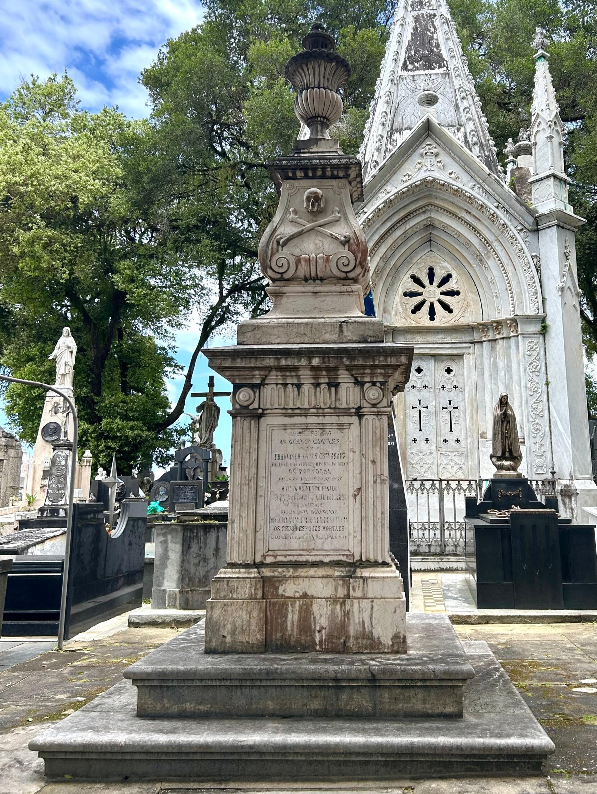 Entre os destaques estão a imponente Estátua da Fé, esculpida em 1865 pelo alemão Johann von Halbig, e a Capela de Nossa Senhora da Piedade, referência da arquitetura neogótica. O espaço também revela símbolos que convidam à reflexão, como colunas, arcos e figuras que remetem à eternidade e à transitoriedade da vida.